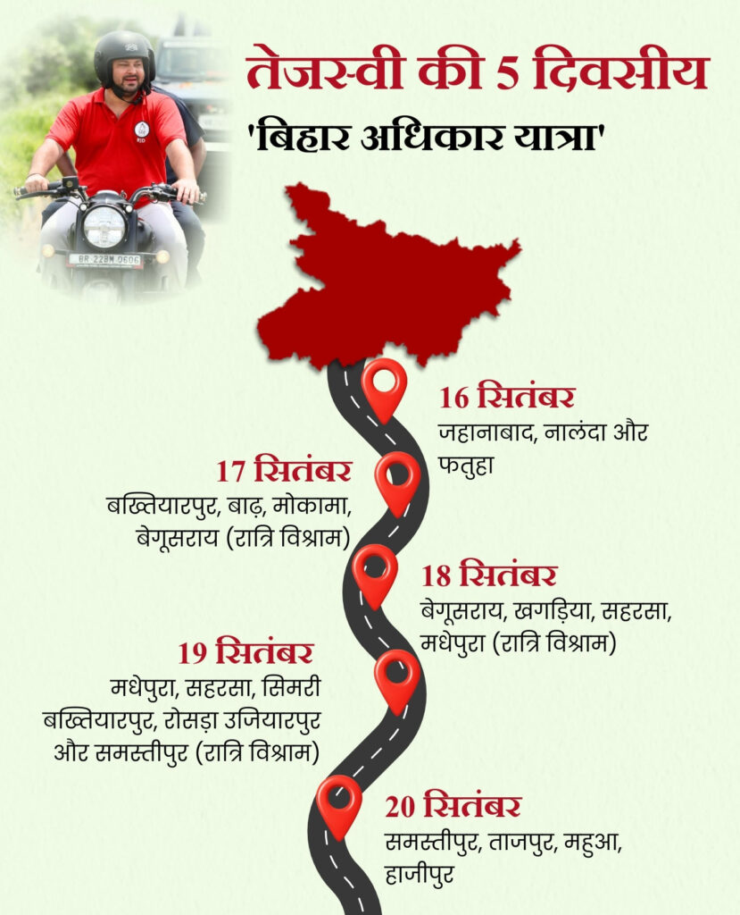 कहां-कहां जाएगी यात्रा?: तेजस्वी यादव की ‘बिहार अधिकार यात्रा’ पहले दिन यानी 16 सितंबर को जहानाबाद, नालंदा और फतुहा। दूसरे दिन यानी 17 सितंबर को बख्तियारपुर, बाढ़, मोकामा, बेगूसराय। 18 सितंबर को बेगूसराय, खगड़िया, सहरसा, मधेपुरा, 19 सितंबर को मधेपुरा, सहरसा, सिमरी बख्तियारपुर, रोसड़ा, उजियारपुर और समस्तीपुर और आखिरी दिन यानी 20 सितंबर को समस्तीपुर, ताजपुर, महुआ और हाजीपुर से गुजरेगी। 17 से 19 सितंबर तक तेजस्वी उसी जगह रात्रि विश्राम करेंगे, जहां उस दिन की यात्रा खत्म होगी।
