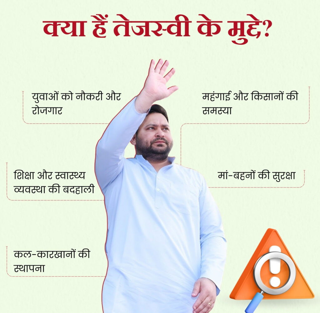 क्या है यात्रा का एजेंडा?: इस यात्रा के दौरान तेजस्वी यादव ‘वोट चोरी’ के साथ-साथ जनता के बीच उन मुद्दों को भी उठा रहे हैं, जिन्हें वह लगातार कहते रहे हैं। पत्रकारों से बातचीत करते हुए तेजस्वी ने कहा कि ‘नया बिहार’ बनाने के लिए उन लोगों ने जो संकल्प लिया था, उसके बारे में जनता से संवाद कर रहे हैं। महंगाई और गरीब को हटाना, किसान और मजदूरों का सम्मान, मां और बहनों की सुरक्षा और बिहार में कल-कारखानों का अभाव जैसे मुद्दों को लेकर वह बिहार अधिकार यात्रा पर निकल पड़े हैं।