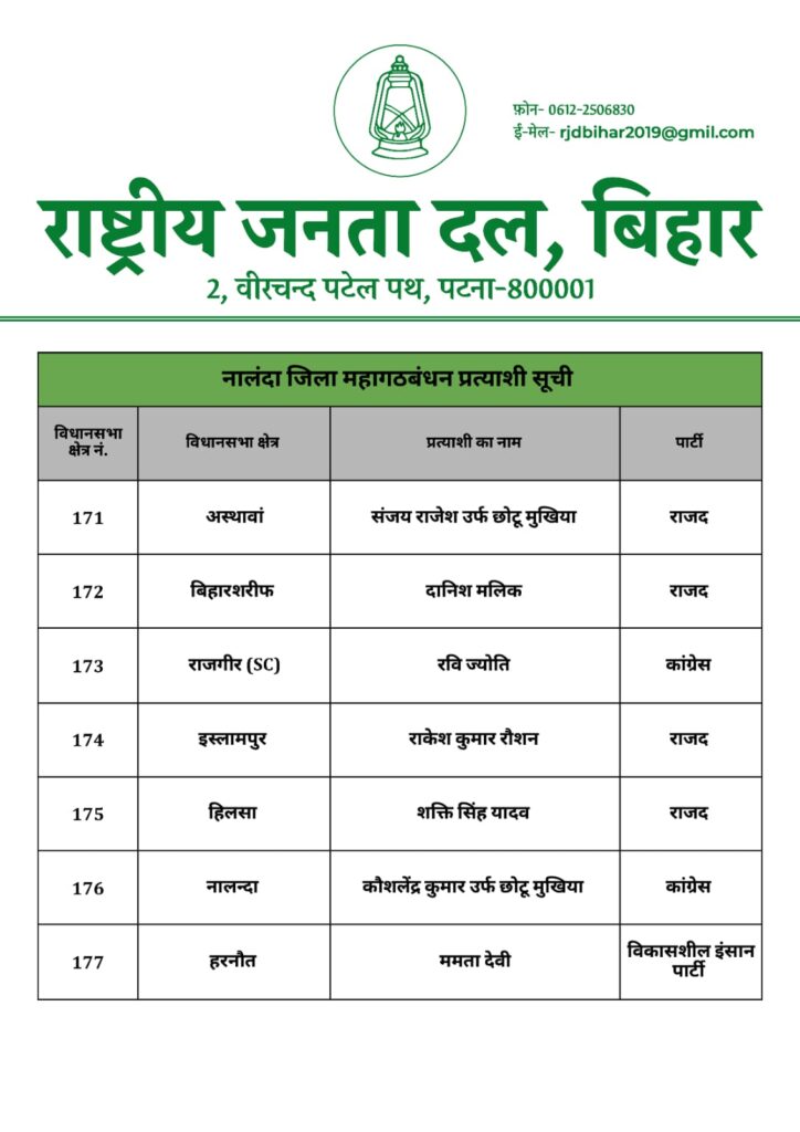 राष्ट्रीय जनता दल के Letter Head से शनिवार को सोशल मीडिया पर तेजी से एक लिस्ट वायरल हो रही है। इस लिस्ट में नालंदा के सातों विधानसभा क्षेत्रों के नाम अंकित हैं। इसमें चार सीटें राजद, दो सीटें कांग्रेस तथा एक सीट वीआईपी को मिली है। इस लिस्ट में विधानसभावार सीरियल नं से दिए गए हैं। सबसे पहले 171- अस्थावां में राजद से संजय राजेश उर्फ़ छोटू मुखिया, 172- बिहारशरीफ में राजद से दानिश मलिक, 173- राजगीर (SC) में कांग्रेस से रवि ज्योति, 174- इस्लामपुर में राजद से राकेश कुमार रौशन, 175- हिलसा में राजद से शक्ति सिंह यादव, 176- नालंदा में कांग्रेस से कौशलेन्द्र कुमार उर्फ़ छोटू मुखिया तथा 177- हरनौत में विकासशील इंसान पार्टी (वीआईपी) से ममता देवी को प्रत्याशी बनाया गया है। राष्ट्रीय जनता दल के लेटर हेड से जारी इस लिस्ट में न कोई लेटर नं और न कोई डेट है। इतना ही नहीं, इस लिस्ट पर किसी का signature भी नहीं है। इसके बावजूद विभिन्न सोशल मीडिया ग्रुपों में धड़ल्ले से शेयर किया जा रहा है।